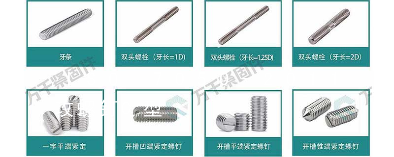 沉頭內六角螺釘(平杯)、半圓頭內六角螺釘(圓杯)、十字槽盤頭機螺釘、十字槽沉頭機螺釘、十字槽大扁頭機螺釘、十字槽盤頭自攻釘、十字槽沉頭自攻釘、十字槽大扁頭自攻釘、全牙絲桿(牙條)、六角螺母、法蘭